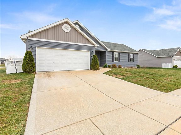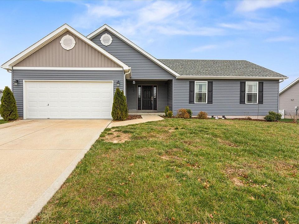 This 6-year-old ranch sits on a spacious corner lot with plenty of green space. New luxury vinyl plank flooring runs throughout the main level, featuring a vaulted great room, an updated kitchen with new appliances and granite countertops, and a dining area that opens to the backyard patio. The oversized laundry room leads to a spacious oversize garage (25x20) with storage. Four bedrooms, including a bright primary suite with an attached bath, plus a full hall bath, complete the main level. The basement is framed and drywalled, with electric installed, and includes a deluxe bath with a large shower. Conveniently located off Highway MM, with easy access to Highway 64/40.