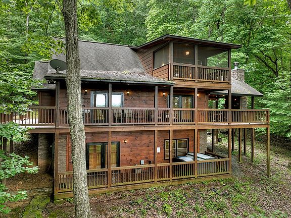 With panoramic mountain and canopy views, an open floor plan w/ rustic finishes and modern touches, soaring cathedral ceilings, wraparound decks, and a private location, there's no question behind the name Freedom Overlook! Complete with three large ensuites, fully furnished and turn-key, full two car garage and storage, and walls of glass. On the exterior main level, guests will find themselves enjoying the large party porch with stacked stone F/P. On the terrace level, find a full den space and game area as well as an additional outdoor deck with spa and jacuzzi area. Kitchen and bathrooms have been updated with granite countertops and feel luxurious for this rustic mountain retreat. Minutes to both Lake Blue Ridge and Downtown Blue Ridge, this rustic charmer would make for a perfect full-time or second home!