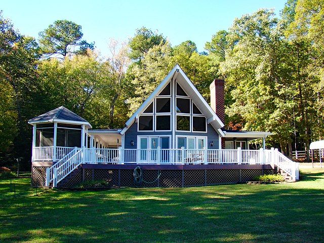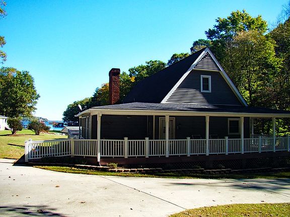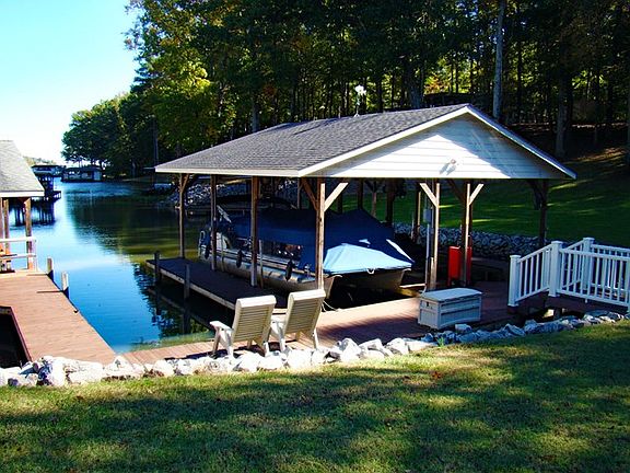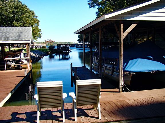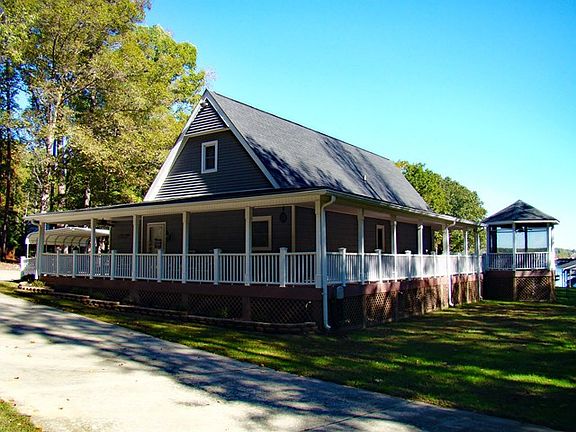 Beautiful A-Frame home features a complete wrap-around deck with a screened gazebo & concrete circle drive. This LOW MAINTENANCE home has vinyl siding, vinyl handrails & composite decking, as well as composite decking on the TRIPLE boathouse! Home is handicapped accessible and has a FLAT lot out to the waterside. Enjoy the beautiful views of the MAIN LAKE tucked back into a protected cove. Main level has 2 bedrooms, kitchen, laundry, Florida room, living room and very large bathroom. Upstairs you have the master bedroom and master bathroom with great lake views. Cozy up to the gas log fireplace on those cool days and enjoy the lake view through the wall of windows. Boathouse has 2 covered slips, 1 open slip and good water depth. Irrigation system pumps from the lake. 2 storage buildings to host your outdoor equipment & lakeside toys. Furnished w/ exception of a few items