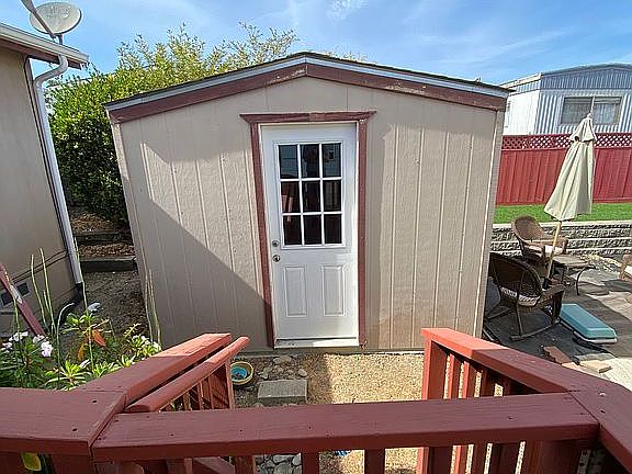 You will feel a sense of serenity when you come home to this amazing place. It offers an ease of lifestyle that is hard to find anywhere else. The quality is evident when you enter the park with extra wide roads that render a feel of elegance not found in many parks. Private pool and clubhouse create a resort lifestyle. This home is on a corner lot which gives it added privacy and some nice views. Wonderful 2 bed/ 2ba single level with a large front porch for soaking up the sun. Fully Handicapped accessible and immaculate. Just enough room to enjoy some gardening. There is a custom storage shed to match the home. High ceilings laminate floors and a walk-in closet in the master are just a few amenities. This is the perfect location, you are minutes to shopping, beaches and parks and quick easy freeway access. 55+ community.