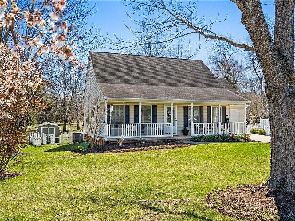 Feels Like Home! Immaculately maintained cape cod with single level living! The charm starts out front with the oversized, rocking-chair ready front porch. Hardwood floors and plenty of natural sunlight in the living room. Kitchen/dining combination room features tiled flooring with decorative inlay, breakfast bar, gray cabinets and stainless appliances. Main level owner's suite with private bathroom and double closets, and a laundry room complete the first floor. Second level features two bedrooms, a full private bath and plenty of closet space. Plenty of space to entertain outdoors with the back-yard deck, and level yard that is surrounded by a white picket fence. Conveying storage building, the attached garage, and interior home and garage floored attics add plenty of storage! All you need on one level, plus space and privacy for your guests upstairs. Your search is over... make it yours!