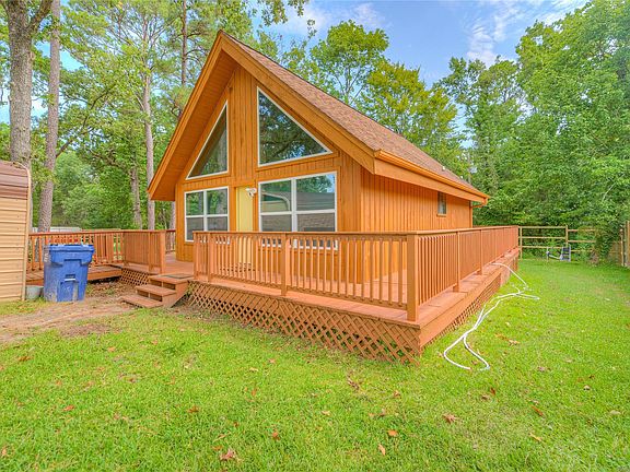 Cozy and Inviting A-Frame Cabin! 2-bedroom, 1.5-bathroom cabin. Within Minutes to Lake Livingston for Fishing and Recreating. Open Concept with Vaulted Ceiling in Living/Dining with Lots of Windows. Kitchen with Breakfast Bar to Dining and Main Living - Bedroom and Full Bath on Ground Level - Second Bedroom and Half Bath in Loft Room OR would make great Office! Enjoy the Wrap Railed Porch and Serene Setting. Home is partly furnished.