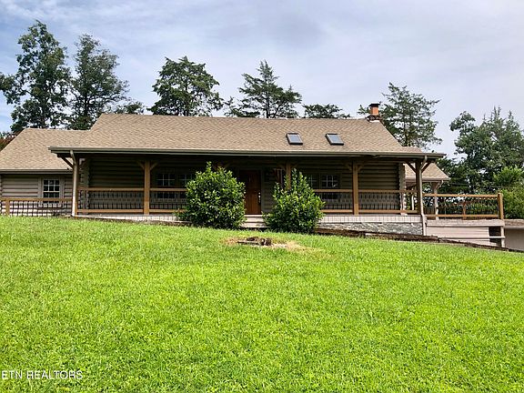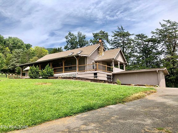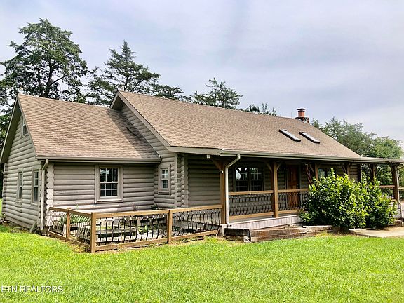 Log home in La Follette with beautiful mountain views! Covered full length front porch with wraparound on one side and large rear porch. Living room with vaulted exposed beam ceiling and stone wood-burning fireplace. Eat-in kitchen with access to covered side porch and back porch. Laundry/mud room with closet and access to back porch. Master suite and bathroom with garden tub with walk-in closet area. Guest bathroom with tile surround tub/shower. Guest bedroom and office with closet on main level. 2 closets in main level hallway. Upstairs features a small loft overlooking the living room & kitchen and a large bonus room with closet. Detached storage building. Attached storage shed - large enough to park 2 cars.