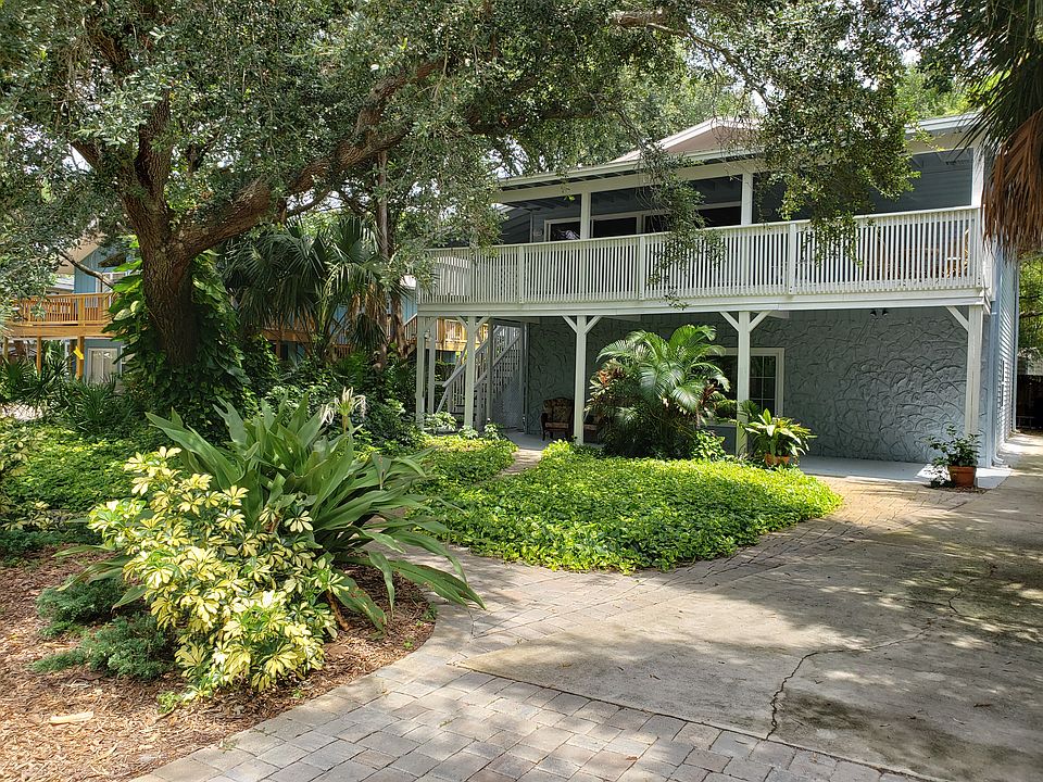 Calling all investors and 2nd home people! This 2 story beach multigenerational home has 2 full kitchens; zoned single family, w/ 2 living quarters. Listen to the ocean at night, morning coffee on a covered deck under a shady oak canopy, look out over a lushly landscaped front yard. Located in a very desirable area in Vilano Beach, residents can easily walk to the beach, the river, restaurants, grocery, and bike ride into historic Saint Augustine. Because of a very large 3 bedroom mother-in-law suite with separate entrances, this 2 story home offers countless options: rent or AirBnB 2 separate units, live in one area and rent out the other, or just open the interior stairs door for 1 big home. Downstairs includes open kitchen/living room, 3 bedrooms, 1 bath, laundry, covered front exterior sitting area. Upstairs includes an open kitchen/huge great room with, 2 bedrooms, 1 bath, laundry, large covered deck looking into the oaks and over the front yard. Comes furnished and fully stocked (including all kitchen supplies, bedding, towels, etc.) making it turn-key ready (depending on your bed selection) for TWO furnished rental or AirBnB units. No HOA, very desirable neighborhood, quiet street. Recent renovations: new siding, replumbed, new water softening system. Separate AC systems for individual unit control. Ample parking. Lush ground cover, no maintenance. Adorable!!