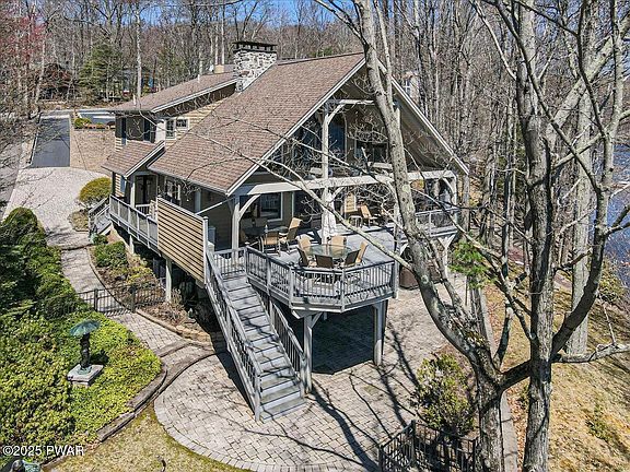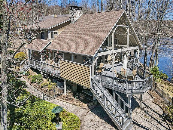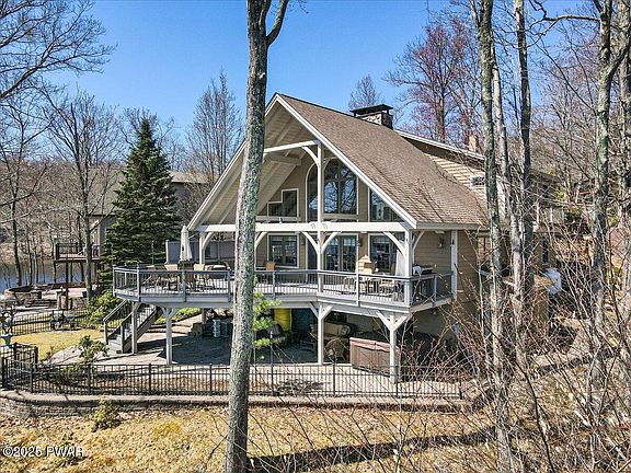 Welcome to this ABSOLUTELY GORGEOUS, custom built, timber post and beam LAKEFRONT home. Enjoy all that the 4 seasons have to offer at Lake Wallenpaupack this year! This home is PERFECT for the lake enthusiast and has EVERYTHING you could want and then some!!! Enjoy a perfectly kept exterior with a paved driveway, upper and lower paver parking area, beautiful wood siding, perfectly placed statues that create such a peaceful setting, a fenced backyard, upper-partially covered trex deck, a lower paver & stone patio, whole house generator, multiple seating areas, a panoramic lakeview AND SO MUCH MORE!!! Step inside and this Timber post and beam structure has such a warm and delightful feel. Enjoy the open floor plan with beautiful hardwood flooring throughout. Floor to ceiling stone fireplace extends from the basement through the main ceiling. Updated kitchen with custom cabinets and Corian countertops a kitchen island and a cozy workspace ALL with breathtaking views of the Lake. Enjoy 5 bedrooms PLUS 2 loft areas AND 5 full bathrooms including a large primary bath within the primary suite PLUS an attached office loft and walk in closet. Head up to the 3rd level and ALL of the kids have found their space to hang with their friends and family for years to come! Basement features a full bathroom, office/den, full bar w/ granite countertops, wine fridge, compactor and sink, workout/game room and a walk-out directly to the Lake. On the back patio enjoy your 8-person Emerald Spa hot tub, stone patio seating area and storage for all of the lake toys and games. Upper yard is fenced and has a nice grassy area to enjoy.Step down to the lower level and enjoy another large entertaining area overlooking your dock and the big lake! Docks are composite & metal and have built in seating, a table, ladders and a slide! Dock has plenty of space for entertaining the entire family.Rental friendly community w/ township approval.