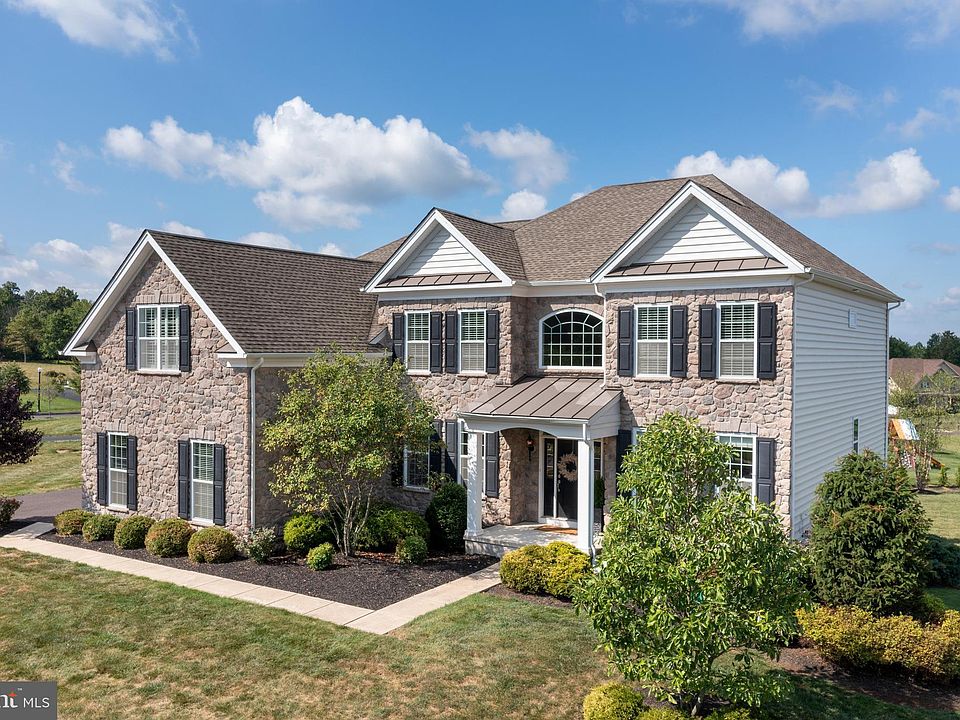 Positively stunning stone front home only 7 years young in the highly desirable Preserve at Hilltown by Toll Brothers. Enter through a covered entrance into a 2-story foyer with a curved staircase and hardwood floors. The foyer is flanked by the living room and dining room, both bright, spacious and nicely appointed. The gourmet eat-in kitchen is the star of the home with gorgeous white cabinets, granite counters, tile backsplash, expansive center island with seating, pantry, and stainless steel appliances. The adjacent eating area has a skylight and French doors to an elevated deck overlooking the large rear yard and steps to ground level. The kitchen is open to a 2-story family room with a beautiful gas fireplace with stone surround that extends to the ceiling. A private office is perfect for work from home opportunities. A powder room and separate laundry room complete the main level. The main bedroom offers a trayed ceiling, separate sitting area, three walk-in closets, vanity area and luxurious bath with a soaking tub, walk in shower and dual vanities. A second bedroom boasts an en suite full bath while the other two bedrooms share a hall bath. Full walkout daylight basement and three car garage. Warm neutral decor, rich appointments and great natural light throughout. Prime location with easy access to parks, recreation, businesses and commuter routes.