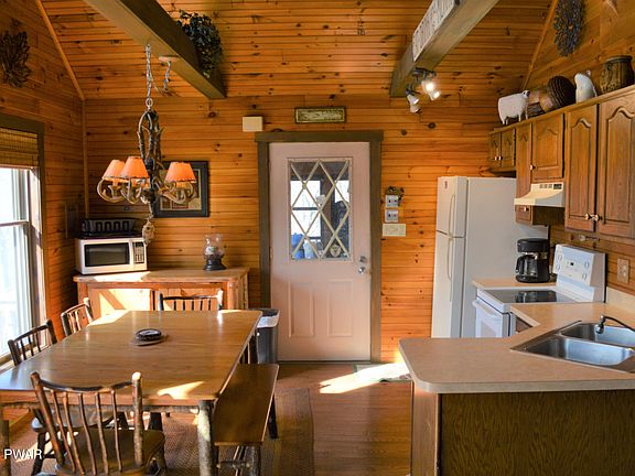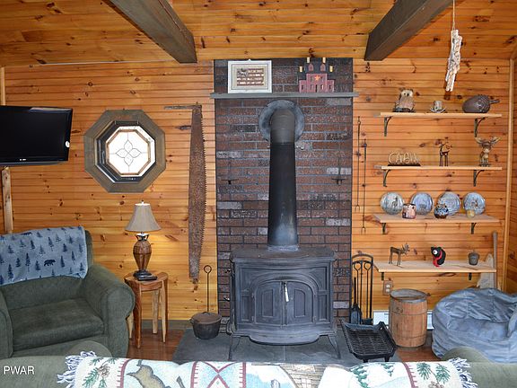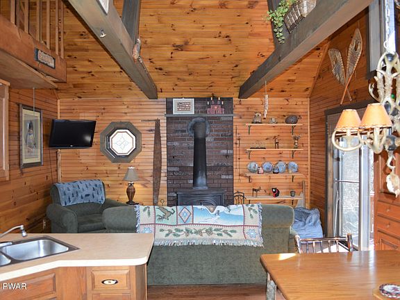 Offer has been accepted. Pristine, well maintained 2 BR plus sleeping loft, 1 BA chalet situated on 7.77 acres of private, wooded land is located off the beaten path, & is truly an outdoor enthusiast's dream! With abundant windows for plenty of natural light the Main floor features include the eat-in kitchen & living room complete with hardwood floors, a wood stove, cathedral ceilings with rustic open beams. Other amenities include a large deck with winter views of Camelback, a flagstone patio, a walk-out basement, fire pit, and a very private lane. This home would be the perfect vacation home or full-time residence for those who love peace and quiet. This home comes furnished and is airbnb friendly.