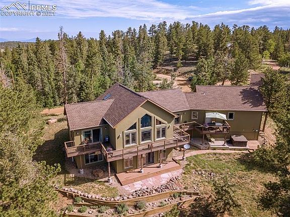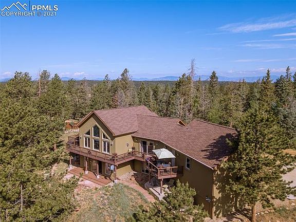 A slice of Heaven on Earth! This beautiful CUSTOM, Rocky Mountain home will not disappoint. Nestled in the pines, the majesty of UNOBSTRUCTED Pikes Peak views abound. This Colorado Craftsman style home with stucco and shake siding is TRUE main level living AND move-in ready. Open concept main level with soaring, vaulted pine ceilings in the living room. Hardwood trim & solid wood doors throughout. Upgraded windows scale the soaring living room walls with magical views. Custom gas fireplace with walnut mantle & floor to ceiling stone. Kitchen adorned with solid hickory cabinets, stainless appliances, granite, slate backsplash, rustic hardware, & large eating bar. Upgraded lighting fixtures throughout home. Large pantry and laundry/mud room with tile floors and easy access to oversized 3-car garage. Teak wood deck graces the entire front of the main level to enjoy the beautiful scenery & gorgeous Colorado sunshine. Main level master boasts newer carpet, walkout to deck, vaulted ceilings, generous master closet, upgraded windows, & upgraded light fixtures. Adjoining master bath is light and bright with custom tile floors, hickory dual vanity with quartz, large soak tub/shower combo, & vaulted ceiling. Basement includes 2 large secondary rooms with gigantic closets & views. Large basement rec room is plumbed for gas, boasts 9 ceilings, includes a wet bar with fridge, & several closets. Basement bath has hickory cabinets, dual vanity, oversized tub/shower combo with custom tile, & linen closet. Walkout to lower level patio with space to install a hot tub! Newer detached 2-car garage that matches home. Easy to maintain landscaping, outdoor sitting areas. Newer roof & exterior paint. Roof includes gutter guards and ice shield. Garage plumbed for gas furnace. Neighborhood lakes to enjoy fishing, non motorized boating, & hiking! Close to public BLM land with miles of ATV & hiking trails. Your Colorado Mountain dream home awaits dont miss this opportunity!