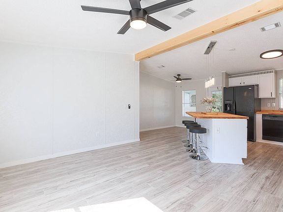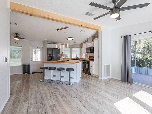 BRAND NEW ROOF! You are going to want to see this one! Set back on a spacious lot with long driveway and lots of parking, this beautifully renovated 2/2 home is ready for new owners! This home is tastefully renovated with modern farmhouse finishes, new vinyl flooring throughout, gorgeous lighting, large kitchen with shaker cabinets, butcher block countertops, large island, all black appliances, absolutely breathtaking! Included in the home is washer and dryer, counter top stools, large screened front porch! This home is a must see and is move in ready! Mid Florida Lakes is an active adult community with top notch amenities including access to the Harris Chain of Lakes, fitness room, 2 swimming pools, shuffleboard courts, horseshoes, cornhole, dog park, tennis and basketball, many activities, classes and events! Seller is Motivated, bring all offers!