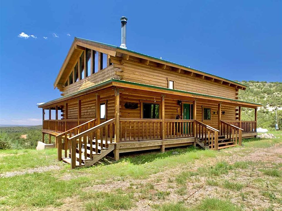 Spacious log home sits grandly atop 5 mountain acres with sweeping views to the south, east & west. Main level has covered decks on 3 sides, large master suite, living with soaring ceilings, cooks kitchen & laundry. Large loft + 2 BRs & bath upstairs. Walkout basement has game rm, office, BR#4, bath, deep larder, & hot tub on patio. Emergency water storage, generator & 2 heat sources. Huge 36'x30' garage/shop stores 3-4 vehicles. Approx 1.7 mi from Ntl Forest as crow flies. Horses OK. Most furnishings neg