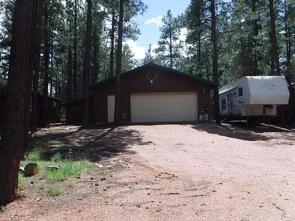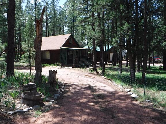Quaint cabin situated on huge 1 acre lot in the tall pines! For extra privacy it backs up to USNF. It features an open floor plan with and energy efficient wood stove in the living room. 2 bedrooms plus a loft, 1 -1/2 bath. Nice relaxing covered front porch, 2+ car garage and fully fenced yard. Private well with 900 gallon storage tank. This home is perfect for a vacation home or full time residents. Dividing wall in the garage can stay or be removed. Kitchen hutch is included in sale. Signal booster, signal booster antenna and pole are not included in sale. Owner/Agent