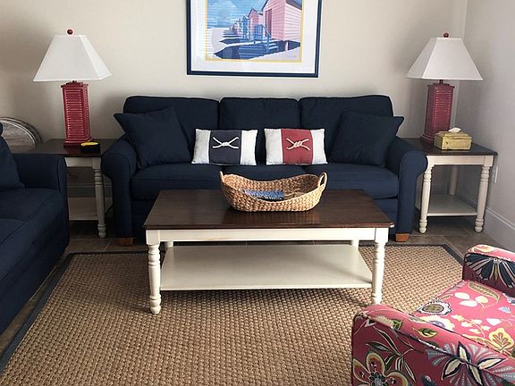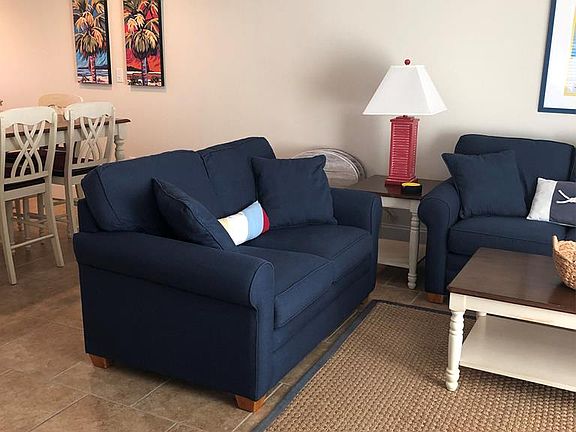 Gulfview 2 BR/2.5 BA unit in Barrier Dunes. This property is located on the larger pond in Barrier Dunes and has a unobstructed view of the Gulf from the master bedroom. Well maintained with beautiful decor, this property is perfect for a vacation home or your personal beach retreat. The first level is tiled and has a sleeper sofa, loveseat, chair, 32" flat screen, bay window w/cushions, bistro dining table and chairs (seats six). There is a deck off the living room that overlooks the stocked fishing pond. The kitchen is well equipped with a pantry, utensils, appliances, cookware, and dishes. Also on the main level is a half bath upgraded with a custom cabinet with granite. The second level has two bedrooms with full baths, laminate flooring, king beds, closets, and TV. Laundry is located on 2nd level. A MUST SEE!!!!
