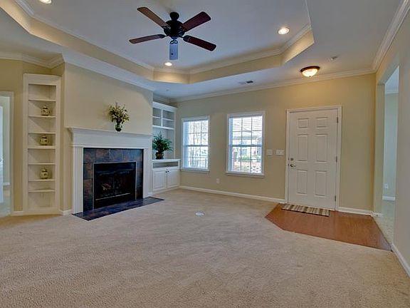 - LIVING ROOM DESC: Carpet, 9? Ceiling, Fireplace, Crown Mold, Ceiling Fan, Trey