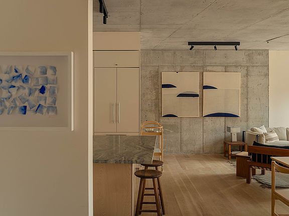 Corner Residence 5A comprises 1,193 SF, offering two-bedrooms, two-bathrooms, and East, South, and West exposures. Upon arrival through a separate entry landing, white oak floors, exposed concrete ceilings and natural lighting from the large South- and East-facing windows in the living/dining area set the tone for modern, design-forward living.