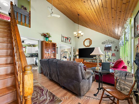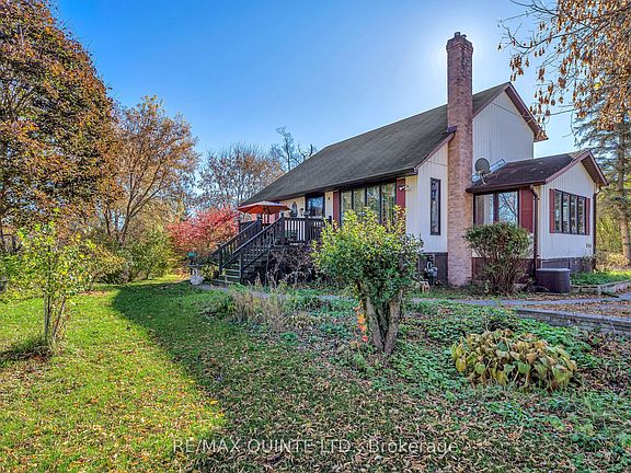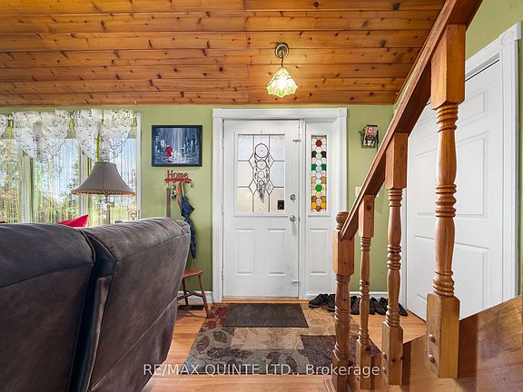 Nestled beautifully on 1.7 acres on the edge of town, this well-maintained 3-bedroom, 2-bath home offers the perfect blend of privacy and accessibility. Enjoy the serenity of mature trees, gardens and green space, all while being just minutes from amenities and with quick access to Hwy 7 for easy commuting.  Step inside to find a welcoming main floor complete with a living room that features a vaulted wood ceiling, a combined kitchen and dinning space, an inviting sunroom/flex space with an abundance of natural light and also a convenient main floor bedroom, full bath and laundry room. The spacious deck is ideal for outdoor entertaining or quiet mornings surrounded by nature. Upstairs, you'll find two additional bedrooms and the second bath, offering ample space for family or guests. The partially finished basement provides flexible living or hobby space with access to the attached single-car garage leading out to one of two driveways with plenty of parking. Whether you're seeking privacy, garden space, or simply a peaceful retreat close to town, this property is ready to welcome you home.