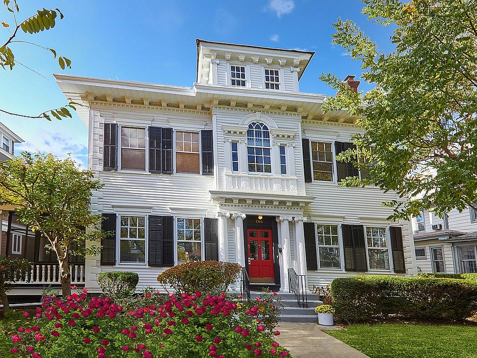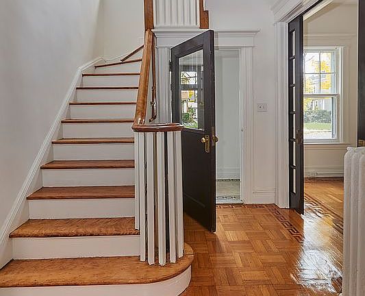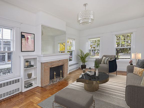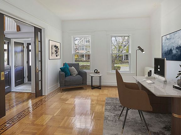 The upper levels can be accessed via the main staircase, or by a convenient rear staircase just off the kitchen. The second level has four large bedrooms and two full bathrooms, including a primary ensuite with an adjacent office space, ideal for an easy expansion into a massive primary suite. The two South facing bedrooms on this level exit to a rare 31' balcony. The top floor has three more bedrooms, each with its own massive storage closet, a versatile library/study space and a full bathroom. The expansive finished basement has a convenient full bathroom with a walk-in shower, perfect for washing dogs and humans alike, and a stairway to the rear garden.