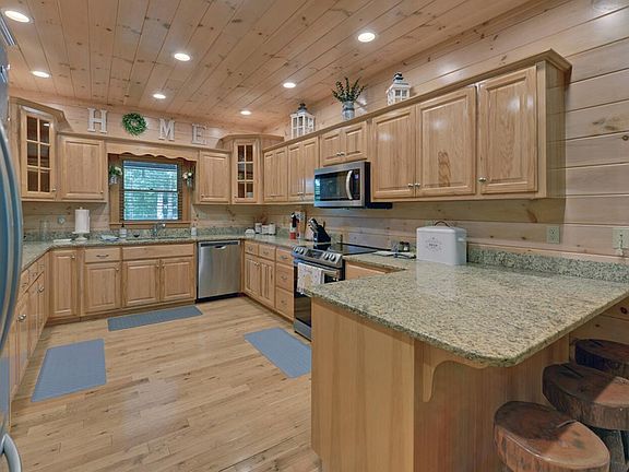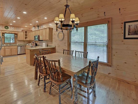 Enjoy a breath of fresh air at this exquisite mountain home, which includes 4 bedrooms, each with their own private bath. A true mountain home cabin, it has potential as a primary, secondary, or rental home. Boarding National Forest with Wildcat creek just a short hike in the forest at the back of the home, this cabin is a nature-lovers dream. Greet guests in the foyer before heading into the great room, which boasts cathedral ceilings and a rock fireplace while flowing into the dining area. The kitchen features granite countertops and stainless appliances. The master rests conveniently on the main floor with a walk-in closet and spa tub in the bath. Upstairs, a balcony overlooks the great room, which leads to another 2 additional bedroom suites. Take advantage of the shuffleboard and ping-pong tables in the downstairs area as furnishings are included. Note the drive-under garage, and all roads leading to the home are paved. Your mountain dream come true.