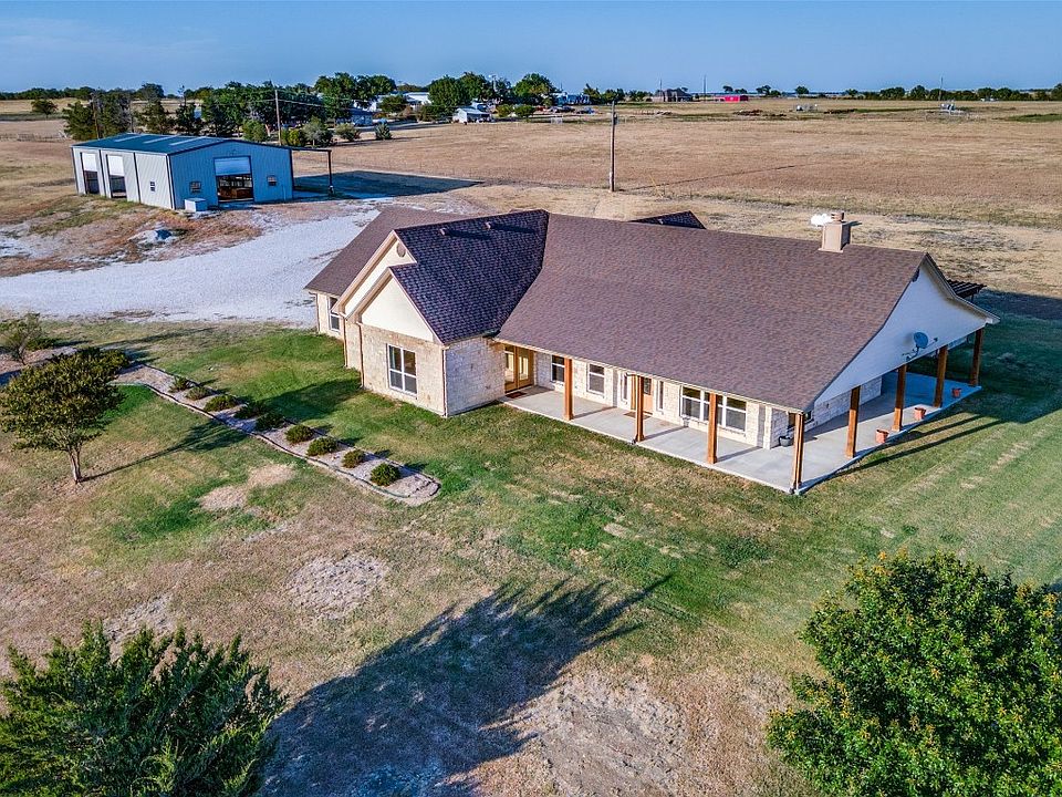 Stunning 40-acre Ag Exempt property 40 min from downtown Ft Worth! Impeccably maintained, single owner, custom-built. Open concept, vaulted ceilings, picture windows, stone fireplace, granite counters and many custom touches. Watch sunset from your wrap around porch or grill at the outdoor kitchen. Bedrooms all have views, plus a bonus room off of the primary is perfect for nursery, office, workout or reading area. Oversized separate laundry area with sink, toilet and room for a freezer. Separate HVAC for living space and bedrooms. New roof 2022. 40 x 70’ shop building has electricity, running water, built in compressor and storage.