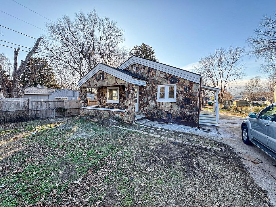 Enjoy this Stone home beauty right next to Evangel University. As you pull up you will notice the gated entry BRAND NEW ROOF, and large front porch with stone columns as well. This ''Giraffe Stone'' home is the one the big bad wolf couldn't blow over. The floorplan has been carefully laid out with an open concept in the front and the 3 bedrooms in the back along with the hall Bathroom. There is also a covered side entry that leads you right into the kitchen with ease of bringing in the groceries. This home also offers a full basement for storage or game room with plenty of windows for natural light. The long backyard overlooks the park and Evangel's campus but the home is close to everything in mid and downtown. You are so close you can smell the BBQ cooking at one of Springfields best/historic restaurants, Crosstown BBQ. Some of the other updates are vinyl windows, Goodman Furnace, and Bradford White Hot water heater.