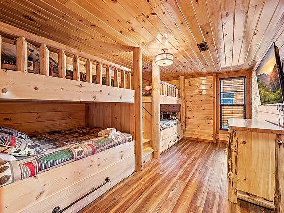 Mountain viewsHeated indoor poolElectric fireplaceCustom log furnitureLoft areaFull length porchOpen floor plan