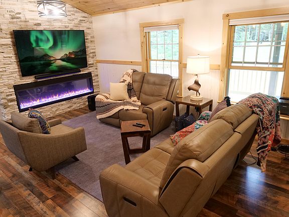 LUCKY BEAR LODGE - Newly Built House - Ski Season Rental - 3 or 6 months! State-of-the-art farmhouse on 3 private acres is the perfect base for White Mountain adventure. Nestled in the woods, the beautiful, just-built oasis has all amenities for 1-2 families. Lucky Bear Lodge is one of the finest brand-new homes in this winter-sports mecca. The house is mere minutes to world-class slopes - 8 miles to Cannon, 18 to Loon, 23 to Bretton Woods. Trails to hike, bike, cross-country, snowshoe, snow mobile and ATV are a fast walk or drive away. Be one of the first families to experience this refreshingly clean and comfy home with a creative aesthetic. Just about everything is new...and we mean everything. You'll enjoy new kitchen appliances; new OLED and QLED TVs; new beds and bedding; new window treatments; new ceiling fans and fixtures; new glassware and cookware...even new wastebaskets! More Details: Inside this mountain sanctuary, you'll discover hand-hewn, vaulted wood ceilings and walls; open floor plan; abundant lighting; magnificent granite counters; and stunning modern decor. Bountiful natural light streams through a multitude of windows into the 1,620-square-foot gem. The windows are dressed in cellular shades from Levolor. There are two enormous fireplaces; chef's kitchen with stools around a large island; extra-capacity washer and dryer; upscale finishes throughout; oodles of art, books and games; and strong Wi-Fi. The inviting exterior is graced by two spacious covered porches that practically surround the house. Luxuriating on either porch, you can sip a cup of steaming coffee during the gorgeous sunrise or a glass of wine during the divine sunset after which the stars put on a dazzling display. The front porch, which stretches the entire width of the house, contains a generous outdoor dining table and 6 chairs; two benches; an oversized rocking chair; and Buddy the Wood-carved Bear to welcome you. There are also 2 ski holders, which accommodate 8 sets of skis, and 2 boot cleaners. The porch off the primary bedroom, with steps to the secluded side and back yards, contains an artsy wicker chair and ottoman as well as 2 chaise lounges. You won't see another house, but you may see a visiting rabbit. Lay back and breathe the crisp mountain air. The fully appointed, one-story Lucky Bear Lodge is in mint condition and offers all-new electronics, including 75-inch QLED Samsung TV and Sonos Arc surround sound in the living room; 65-inch OLED LG TV and Sonos Beam soundbar in the primary bedroom; and 55-inch LG TV in the bedroom with queen bed. Streaming services come from Samsung and LG plus you can use your own. The gourmet kitchen is bountifully equipped with specialty cabinets from Omega Cabinetry; high-end stainless steel appliances from Beko (Europe's fave home appliance brand) including a gas range with 5 burners on the cooktop and a convection oven with air fryer as well as a French-door refrigerator and quiet, powerful dishwasher; cast iron farmhouse sink from Kohler; 4-seat breakfast bar; elegant kitchenware by names including Le Creuset, Mikasa and Fiesta; professional knives by Ergo Chef; Silk tile backsplash by Anthology; coffeemaker; wine glasses; pantry with shelves and pull-out baskets; Vida Sana blender...and everything else you need to create incomparable farm-to-table meals. The kitchen flows to the living and dining rooms. The living room spotlights an exquisite 6-1/2-foot electric fireplace by SimpliFire, which provides additional heat, on a wall of Koryak stacked stone by Eldorado Stone; power-reclining leather couch and loveseat; handsomely upholstered swivel chair; midcentury modern mahogany table; hand-knotted solid Gabbeh wool rug; and plenty of throw pillows and blankets. The large, glass-topped dining room table is amazing for casual bites or dinners for the whole crew, easily seating your family and even extending. It sits atop a hand-knotted Kashkuli Gabbeh wool rug. Unwind in the bedrooms, which feature Fanimation ceiling fans; fresh mattresses and bed linens; naturally inspired rugs; iHome Power Bluetooth Alarm Clocks with Dual USB Charging and Nightlight; and windows with views. The primary bedroom includes an extraordinary fireplace by SimpliFire; luxe king bed with oiled-bronze headboard and footboard as well as Tempur-Pedic mattress; two wood bureaus; walk-in closet; reading corner; sliding glass door to private porch; and ensuite bathroom with a huge shower, double vanity, tile floor and Japanese- or bidet-style toilet by Brondell. On the other side of the home is a light-filled bedroom with a queen-size bed, midcentury modern wingback armchair and hand-woven kilim modern wool rug; a fun bunkroom with double twin-over-twin bunkbeds, polka dot Italian accent chair, and game and toy closet; and a bathroom with a glass-enclosed shower/bath combination, Salt Glossy tile backsplash by Anthology, tile floor and extra-capacity washer and dryer. Need to mix a little business with pleasure? Lucky Bear is perfect for remote work. Take advantage of our workstation with a stylish desk and chair plus task lamp. Free, high-speed internet access comes via Starlink, which provides consistent download speeds of an average 200 Mbps. Delight in unlimited HD media streaming and use your own streaming accounts on any of the 3 Lucky Bear TVs - nothing else is needed. A house phone can be used for local calls. While there's much to do in the area, there's also plenty in the house for apres-ski serenity: A bookcase is filled with nonfiction titles covering travel, leisure and cooking, and lots of toys and games are at hand. Lucky Bear Lodge's outdoor space showcases star-filled night skies. The flat, expansive driveway has a parking area suitable for many cars. There's simple, 5-step access to the one-level home; enter through the mudroom with plenty of space for your outdoor gear and boots. The mudroom centers on a South African glass-topped wood hall table plus a chair, stainl