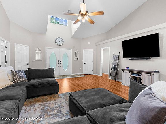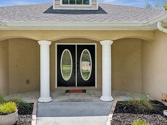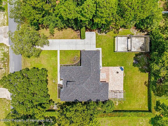 WOW! Check out this Beautiful, Move-in Ready 4 Bedroom, 2 Bath, oversized 2 Car Garage with an additional (partially completed) Detached 2 Car Garage + 2 Car Carport!! Perfectly situated on a half-acre lot that features an extra-long driveway, mature landscaping, and a super private backyard. New 30-year architectural Roof PLUS New 5-ton A/C unit installed in 2023! This Custom Bozzi Built home is meticulously kept and features a spacious, open concept, split floorplan, inside laundry room, newly installed light fixtures and ceiling fans, newly painted interior, newly painted doors + hardware, and newly installed carpet in bedrooms! No HOA! No CDD's! The spacious kitchen features newer stainless-steel appliances, pantry closet, and large double stainless-steel sink! Double doors lead into the spacious Master Bedroom that boasts tray ceilings and his and her walk-in closets. The ensuite Master Bath features double sinks, separate walk-in shower, linen closet and a roomy garden tub with jets! Walk out the double French doors to the backyard that is Perfect for ENTERTAINING! Relax in the screened-in patio area, or BBQ on the extended paver patio firepit area- all while being surrounded by plush greenery and privacy bushes! The plans, concrete slab, and block are already in place for the additional Detached Garage/Gym/Workshop/Mother-in-law Suite - just needs your finishing touches to be complete! Close to great Shopping, Restaurants, Golf Communities, Hospitals, Medical facilities and some of Florida's Top-Rated Beaches. Quick & Easy access to the Suncoast parkway!