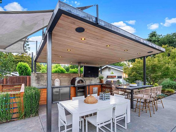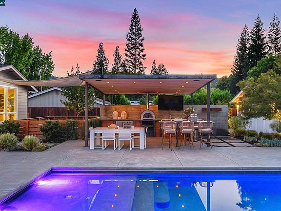 Discover Westside Alamo living with this stunning single-level rancher on a 0.5-acre lot, featuring 4 bedrooms plus office, 3 bathrooms, and seamless indoor-outdoor California living with sliding glass doors leading to a resort-style backyard. Come home to luxury finishes including newly updated wide-plank oak floors and a custom stone fireplace. The primary suite boasts raised ceilings, sliding glass doors to the yard, dual vanity sinks, a separate shower/soaking tub, and a large walk-in closet. Two bedrooms share a full hall bath with pool access, and a fourth bedroom + full bath is ideally located near the kitchen, making it perfect for guests. A private office overlooking the pool makes working from home a breeze, and the detached garage and long driveway offer ample parking and storage. Relax in the backyard oasis featuring an LED pool with Baja shelf & hot tub, and modern pavilion with a pizza oven, fridge, ice maker, built-in BBQ, zen water fountain, and gas fire pit. Conveniently located near Downtown Alamo, and just steps from the Iron Horse Trail with easy freeway access and top-rated schools, make 1440 Jackson Way your next home!