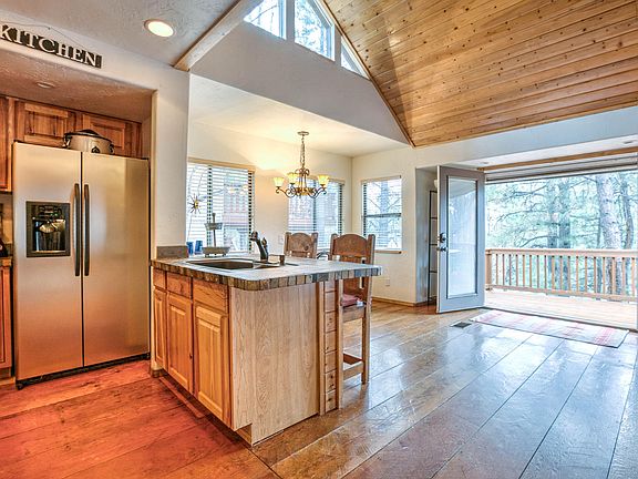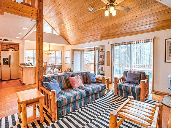 Absolutely charming cabin located at the end of a coveted cul de sac and backing to the forest. Come live among the tree tops and hang with some of the coolest neighbors in Munds Park! This special place feels like home from the moment you walk through the front door. Wonderful great room which opens to the front deck with multiple doors and windows. The kitchen is beautiful with newer cabinets, stainless steel appliances and open to all living areas. Large master down with slider to backyard and deck. Large walk in closet with built ins. Second bedroom and bath up with a bonus 3rd sleeping area perfect for a kids hang. Laundry on the main floor and a huge storage shed for all of your toys. Long driveway with loads of parking. Loaded with natural light and 100% turn key. One of a kind!