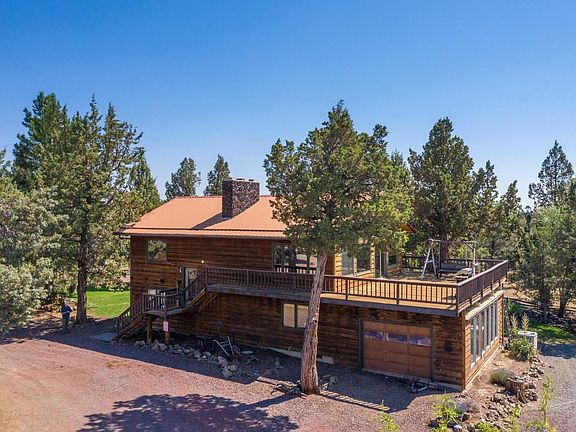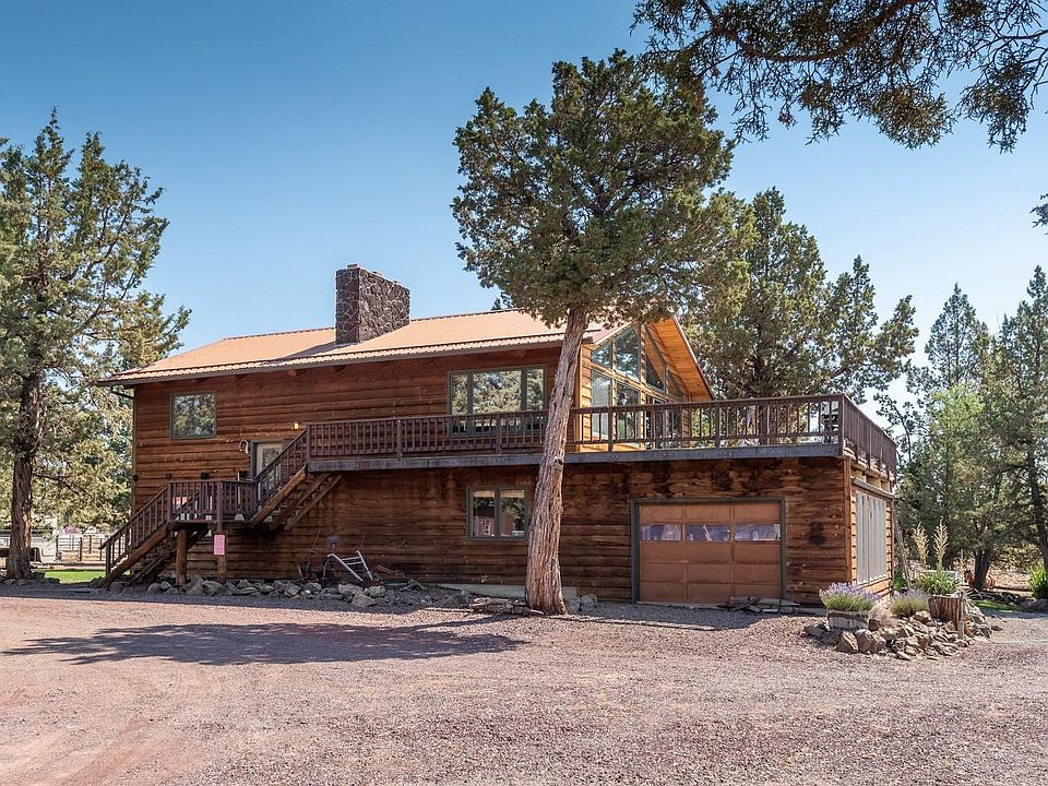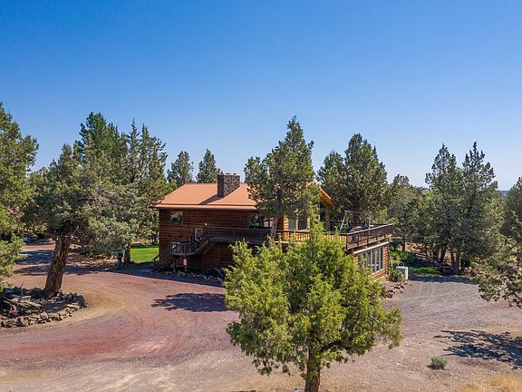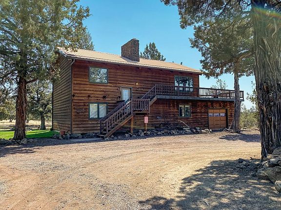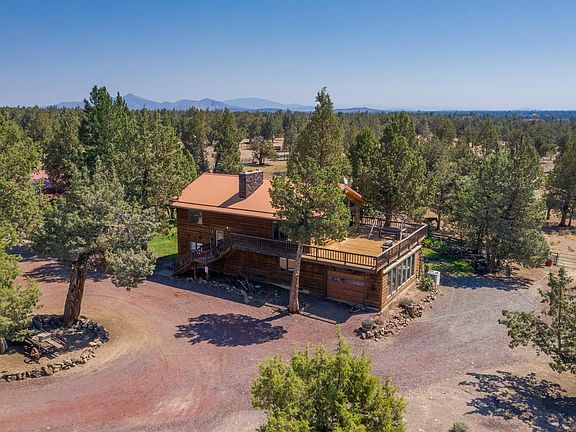 Truly unique & private NW Redmond property that adjoins BLM. The rustic log home sits on nearly 20 acres with Cascade views from the deck and expansive windows, tall rock fireplace and split level living with master on the upper level with living, dining, kitchen, half bath and deck. Downstairs you will find 2 more bedrooms and bath, an office AND bonus family room (converted garage) with access to patio and natural landscaping. Fenced paddocks and stables for horses with a hay barn and training arena, complete with chicken coop and storage. A 2000+ sq ft garage & storage building includes guest quarters with 1bd, 1ba and office and heat pump. There is also a massive 3,000sq ft shop (converted air hangar) with enclosed workspaces, roll up door and an attached 12x76' lean-to for additional storage for equipment, RV, boat etc entirely fenced yard for possible home based business. Located with easy access to Redmond, Sisters and Bend, very close to the Cline Falls Airstrip.