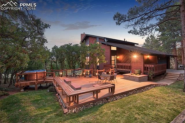True Colorado living right within the city! This beautifully maintained home is very unique, allowing for wonderful privacy and quiet while being just minutes from Academy Blvd or I-25. Huge custom deck features a hot tub, low voltage lighting and lots of space for entertaining. Gas fireplace in the sunken living room and lots of windows give this home a warm and inviting atmosphere. Walk out from the main level onto a second deck, made with composite material, to overlook over half an acre of serenity.