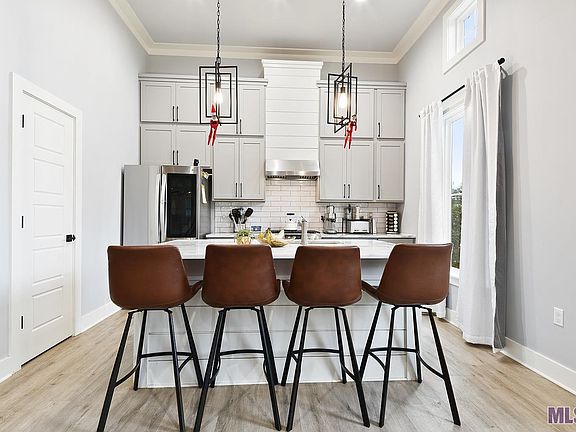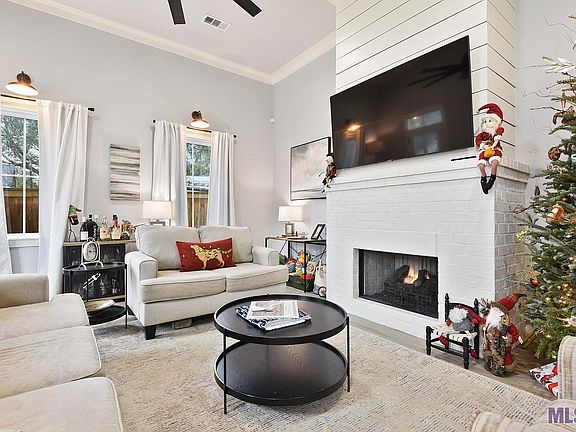 This home feels very spacious with 12 foot ceilings in the open family room and kitchen! The painted brick fireplace centers the living room for balance, there is a large kitchen island with seating for dining. Tons of cabinets for storage as well as a closet pantry and great sized laundry room. This home has never flooded and does not require flood insurance! The circle drive is great for parking and the back yard has a six foot California style fence for full privacy. Off the main bedroom there is a covered patio to the great sodded rear yard. You will see the retaining wall flowerbed in the front of the home that adds to the modern design. Granite & Marble countertops, gas stove, stainless steel appliance, upgrade
