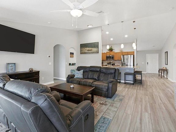 Welcome to this inviting 4-bedroom, 2-bathroom private pool vacation home in South Gulf Cove. This single-story residence offers a spacious floor plan perfect for entertaining and family gatherings. With canal access leading to Charlotte Harbor, a fully equipped kitchen, and dining for six, you'll feel at home in this delightful property. Enjoy parking for three cars in the driveway and one in the garage, with an owner's truck available for rent through another program. This home boasts a fully equipped kitchen, dining for six, and beach supplies including chairs and shark-teeth hunting equipment. The private pool, facing north, is perfect for relaxation, with pool toys provided for added fun. A BBQ is available for complimentary guest use, though guests are responsible for refilling the propane tank and cleaning the BBQ upon departure. Pool heating is available at an additional cost of $200 per week or $500 per month plus tax. This dog-friendly home welcomes pets with a $250 non-refundable fee and a two-dog limit. Dogs must be disclosed and the fee paid prior to arrival. The garage offers one bay for use, and the owner's 2013 GMC Sierra is available through another rental program. Situated in the South Gulf Cove community, this home offers bike lanes, walking trails, parks, and a playground. It's conveniently located near attractions such as Chadwick Park at Englewood Beach (14 miles), Boca Grande (13 miles), Englewood Farmers Market (15 miles), Publix Supermarket at Gulf Cove (5 miles), Anchors Away Charters at Gasparilla Marina (7 miles), Myakka State Forest (14 miles), and Punta Gorda Airport (26 miles). This property is smoke-free for your comfort. Complimentary Wi-Fi is provided, along with towels and linens. A starter welcome packet is supplied, including basic toiletries and cleaning items, but guests are responsible for replenishing these supplies. Check-in is seamless with online email access, and 24/7 on-call maintenance is available. Please note that the pool is serviced weekly and a security camera is located at the front door. The work-from-home set-up includes monitors, a printer, scanner, shredder, display port, and USB-C cables. A laptop computer is not included.