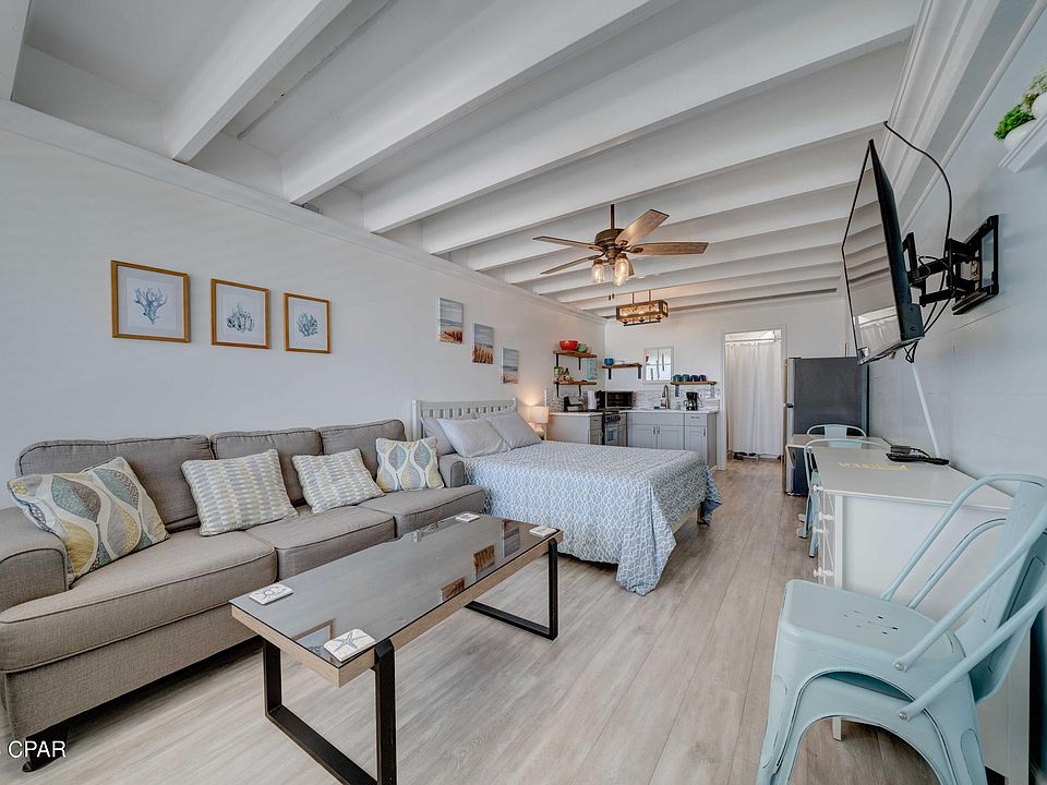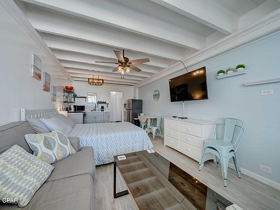 Own in the historic Fontainebleau Terrace! The only condo closest to the water in Panama City Beach. This unit is completely renovated from top to bottom. Fully furnished and rent ready. You will find the natural concrete beams exposed adding to the historic look and clean feel. The floors have waterproof luxury vinyl throughout the studio. Quarts counter tops in kitchen and bathroom. Efficient and eloquent shelving for easy cleaning. This property has a deep large pool and surrounding patios for gilling or just watching sunsets. Don't miss your chance to own your slice of paradise. Contact your favorite agent for showing details.