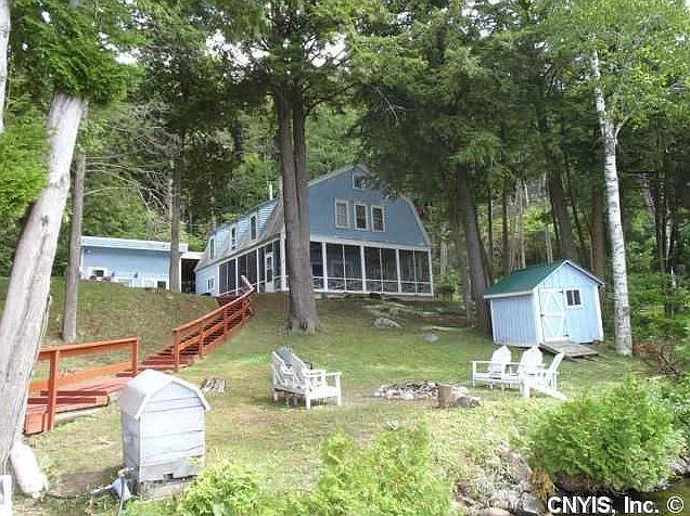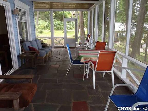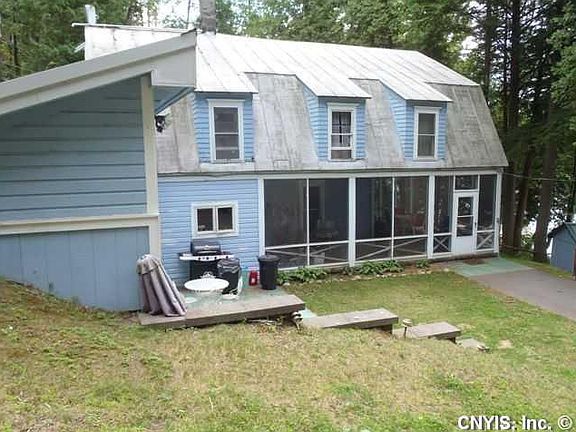 5 bedroom seasonal cottage fully furnished with screened in wrap around porch. Wainscoting throughout. Hardwood floors. Updated kitchen with tons of cupboard space and dishwasher. Wood burning fireplace. Breezeway leading to Granex which has a full bath, laundry facility and bedroom. Patio area overlooking lake. Formal dining room with monitor heater. Double lot which has a fireplace ring and a shed and very large dock with excellent swimming area. Fabulous view of much of the lake and spectacular sunsets. New driveway which leads directly to cottage. No Stairs!! Very easily accessible.