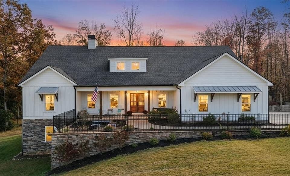 Charming Modern Farmhouse on 4.82 Private Acres! Welcome home to this stunning farmhouse retreat perfectly situated on a partially wooded 4.82-acre lot, offering the ideal blend of privacy and modern comfort. From the inviting front porch to the spacious open-concept interior, this home is designed for both relaxation and entertaining. The front yard is beautifully cleared and grassy, providing a perfect space for outdoor play or gatherings, while the backyard offers a peaceful wooded backdrop for added privacy. Enjoy morning coffee or evening sunsets from the back deck. Enjoy your own fenced garden area with raised beds and a charming picket fence—perfect for growing flowers, herbs, or vegetables. Step inside to a light-filled great room featuring cathedral ceilings and a seamless flow into the dining area and chef’s kitchen. The kitchen boasts custom crisp, white cabinetry, gleaming granite countertops, and high-end GE Café appliances, making it the heart of the home. A separate office or optional formal dining room offers flexible space to fit your lifestyle. The luxurious master suite is a true retreat, featuring a huge walk-in closet and a spa-inspired bath with dual vanities, a soaking tub, and a large tiled shower filled with natural light. The split bedroom floor plan provides three spacious secondary bedrooms and a beautifully appointed hall bath with stylish tile flooring and a tiled tub/shower combo. Enjoy the convenience of the dream laundry/mudroom, complete with custom cabinetry, abundant storage, and a sink — perfect for today’s busy household. Additional highlights include a large two-car kitchen-level garage, extra-wide stairs leading to an unfinished basement (stubbed for a bath) offering endless possibilities, and a walk-up attic with permanent stairs, offering tons of storage, and ready to be finished into a bonus room or additional living space. This exceptional property combines modern amenities with timeless farmhouse charm. Don’t miss this rare opportunity to own a piece of country paradise!