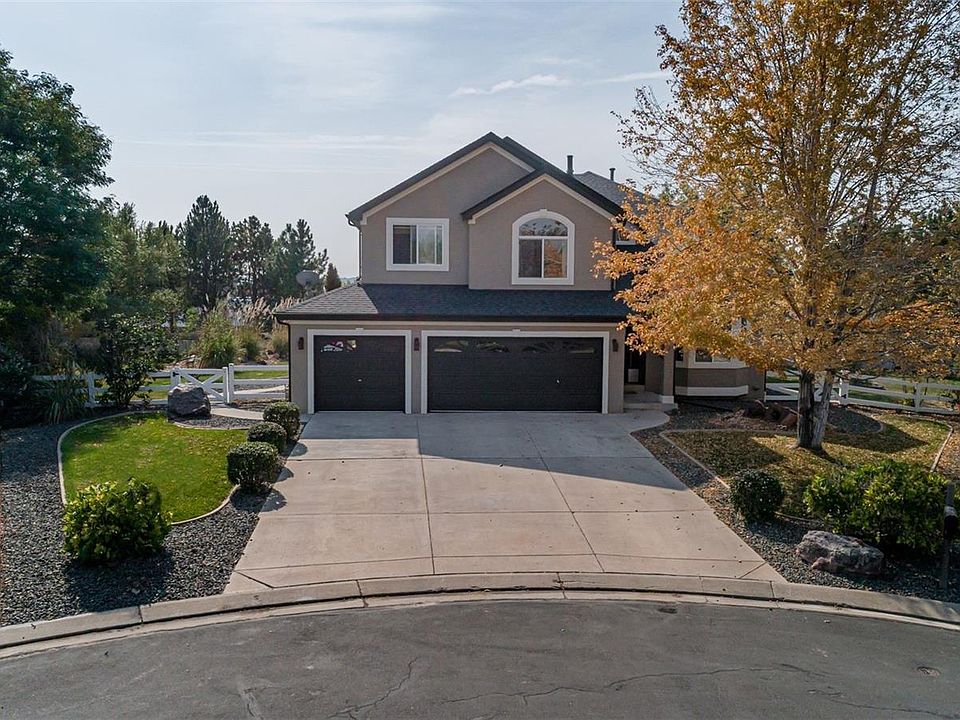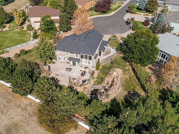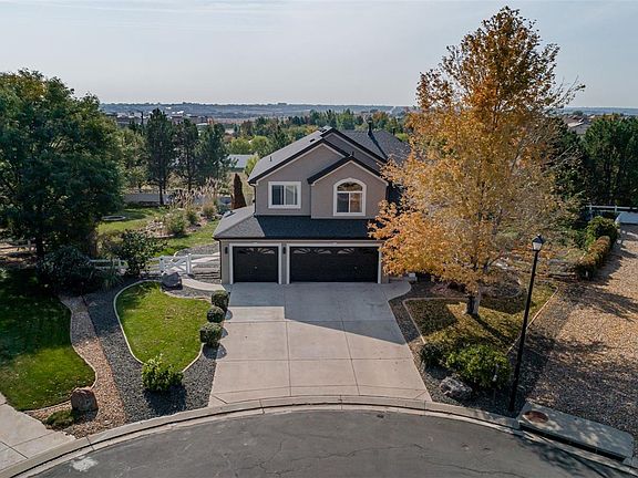 Enter this beautiful home through an exquisite custom front door! This spectacular main floor features extended hardwood floors, vaulted ceilings, main floor study, formal living and dining rooms, 1/2 bath, light bright windows galore (they have been tinted), and fabulous kitchen with granite, huge island, plenty of cabinets, double ovens, 42-inch cabinets, and easy access to your splendid backyard. The rounded staircase leads to the master with fireplace, ensuite with 5-piece bath and huge closet. A loft and 2 bedrooms with a bath in that wing finish out the 2nd floor. The loft overlooks the massive family room. Basement is finished with another family room, game room, bedroom with walkin closet and access to 3/4 bath. Plenty of storage and garden level windows make the basement a wonderful space with multiple possibilities. The 3-car garage is oversized, plenty of room for all of your toys. The private backyard is fantastic with professional landscaping, huge patio, built-in gas grill, fireplace, trampoline and wonderful water feature. This property offers you nearly 1/2 an acre for your enjoyment (.44 of an acre). You'll love the tranquility of all of these added amenities in your backyard. This home is at the top of the cul-de-sac and close to the community's 5 acres park. Wonderful neighborhood beside Orchard Town Center, restaurants, parks, trails and easy access to major highways for your commutes. New paint inside and out. Furnace, A/C, and roof new within the last year. This home definitely shows pride of ownership with it's perfect condition. Convenient school bus stop to Meridian Elementary and Rocky Top Middle School. Please view the 3D video Tour.