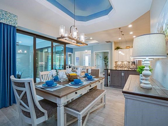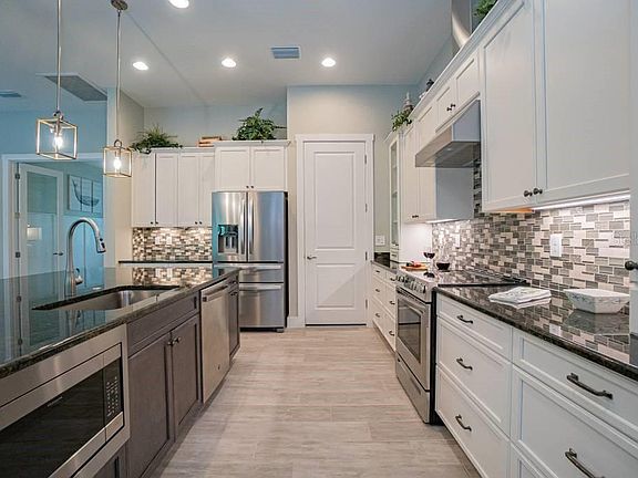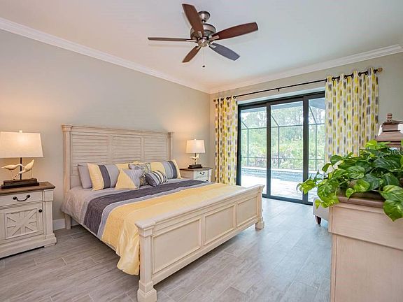 Model home with leaseback. This beautiful 3 bedroom 2 bath home has many beautiful features as well as a large pool/pool deck for your sunning pleasure. Master suite has 2 walk in closets and sliders to the lanai. The lanai features an outdoor kitchen with grill, beverage fridge and sink. Home features open floor plan with coffered ceilings, zero sliders, and upgraded appliances. This energy efficient home is complete with solar panels. A 2 year leaseback with an additional year option.