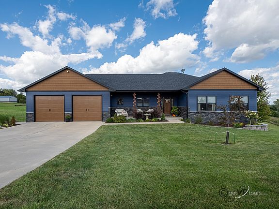 Magnificent 4 Bed/3Bath ranch home that is country living and yet the location is split between Galena (4.5 miles) and Dubuque (8.5 miles) using Hwy 20. Your first outstanding impression is the professionally landscaped yard with 1.26 acres for family living. The home was custom designed, built and decorated by the owners with many upgrades and features not always found under one roof. The entry foyer leads to the great room adjacent to the kitchen and dining area. The great room has access to the deck for enhanced entertaining space and it is centered on the fireplace that is surrounded by floor to ceiling bookcases and a custom TV cabinet. The kitchen is the jewel of this home. An island with granite counter, dual sink, breakfast eating bar and plenty of prep space. Also included in the kitchen is custom Omega cabinetry, butcher block/sealed counters, electric stove top, ceiling range hood, high end black stainless appliances and expansive tile back splash. Adjacent to the kitchen is the pantry, coat closet and 1st floor laundry followed by the extended size heated garage with extra high doors for recreation or commercial vehicles. The 1st floor has the Master ensuite with walk in closet, shower/tub with 2 rain/shower heads and dual sinks with granite countertop. 2 additional bedrooms and bathroom are on the first floor. The lower level features a 2nd laundry, family room, office, 4th bedroom, a bath, and in home business area that is currently a pet grooming center. The second garage on the lower level affords endless storage and room for the yard equipment and the Big Boy Toys. Features and upgrades include but not limited to: Deluxe Vinyl Flooring, 4 Panel hardwood doors, exterior doors with security keypads, security camera system, dual HVAC system, enhanced floor molding, “Hide-a-hose” Central Vacuum System, and ceiling heights of 9’ & 11’. The home is being sold unfurnished and is in the Galena School District.