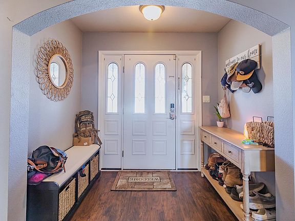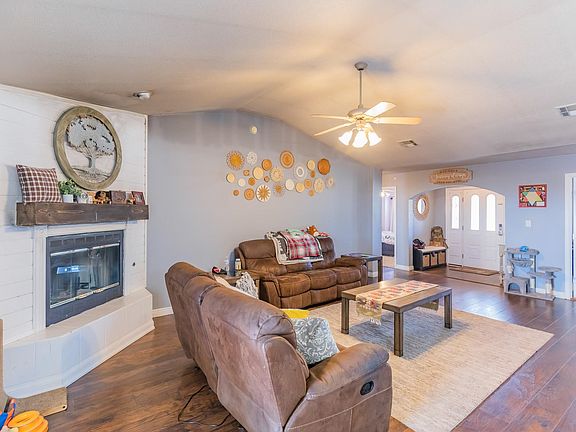 Perfectly situated on a corner lot in the prestigious Hermoso El Sol neighborhood, this home offers 4 beds and 2 baths. With Solar Panels, you will enjoy the benefits of a low electric bill. It features vinyl plank wood flooring, a ship-lap corner fireplace, vaulted ceilings, and a soothing blue color scheme. The kitchen is both functional and stylish with tile countertops, ample cabinet space, an eat-in kitchen, and stainless steel appliances. The split floor plan provides privacy for the primary suite, which includes tray ceilings, recessed lighting, a spa-like bath with double sinks, a jet tub, and a spacious walk-in closet. The 4th bedroom can double as an office or bedroom with double doors. Additionally, there is RV parking on the side of the house, a 2 car garage, and refrigerated air for your comfort. This home offers a perfect blend of style and convenience in a highly desirable neighborhood. Don't miss the opportunity to make it yours. Check out the 3D tour today!