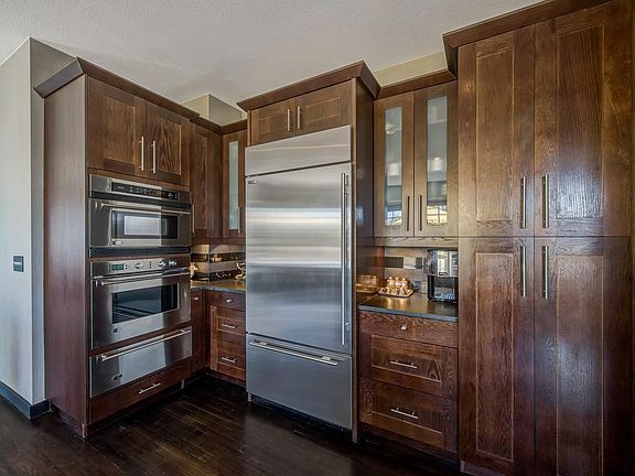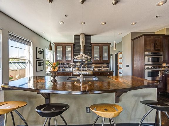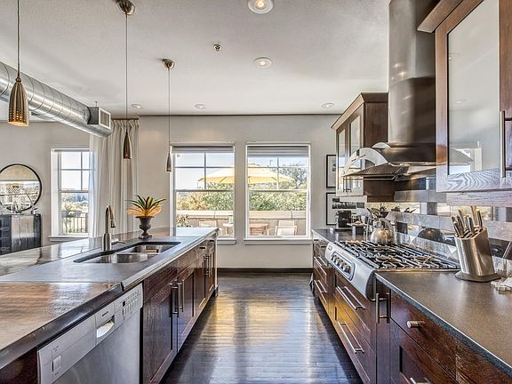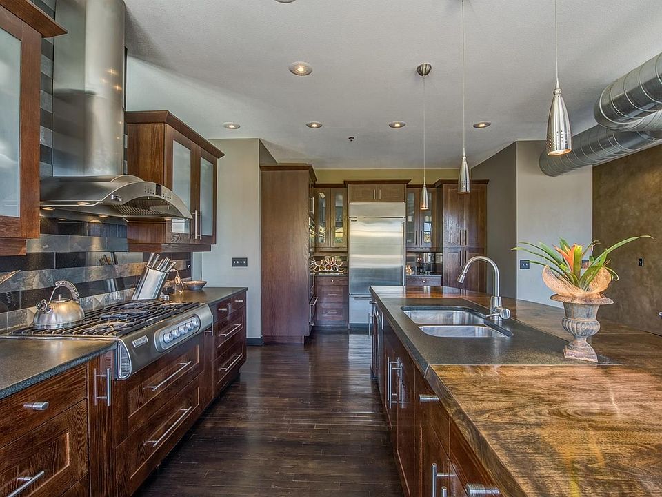 Incredible corner penthouse with wrap around deck with city and mountain views! Open, light filled floorplan, completely updated with gorgeous finishes. Kitchen with honed granite and walnut countertops, under cabinet lighting, and top of the line appliances. Living and family rooms. Ebony hardwood floors, new wool carpet, hanging barn doors, Ginger lighting fixtures, and more. Two master bedroom suites with walk in closets with built ins, stunning bathrooms with Duravit sinks and DWC faucet fixtures. Office/study and powder room. RARE 3 GARAGE SPACES !!! and 2 storage units included.