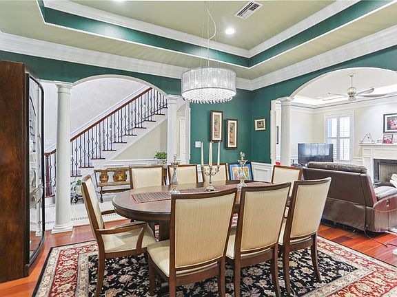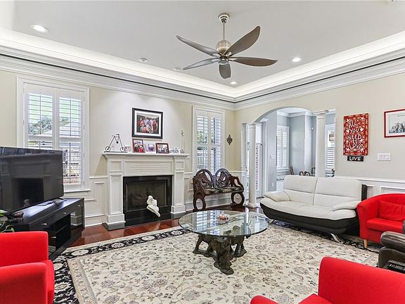Truly exquisite 7 year old, architect- designed custom newer construction just steps to the lake with easy access to the walking path. Total quality throughout. Enter through gorgeous steel front doors into a grand 2 story foyer with stunning light fixtures, marble floors and open concept dining room and den with beautiful arches and columns. Spacious kitchen with stainless appliances including 5 burner stove with pot filler and eye- catching backsplash. Den overlooks oversized back yard and has a fireplace. Primary bedroom has attached office space and light- filled bath with marble vanity tops and even a towel warmer. Oversized double garage, spray foam insulation, central vac system, low flood insurance ($933. currently), Terminix termite contract, hurricane force high- impact windows, and 3 zoned HVAC systems are some of the many custom features in this house. Situated in a fabulous location close to the lake and built to last. A truly beautiful property.