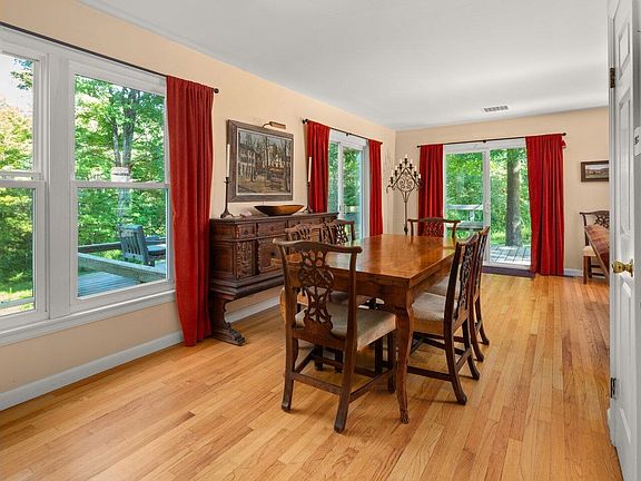 Stunning country setting for this lovely two-bedroom plus office cape on one of Charlotte’s best roads. This lovely cozy home is set back from the road but perched perfectly take in all that nature that abounds! Sunny, open floor plan includes kitchen with pantry, laundry, and separate entrance to west-facing deck. Large living room with wood-burning fireplace insert provides a cozy place to read a book and connects to dining area overlooking the backyard. This home was built to take in the lovely setting with oversized windows, two decks, and three sliders to connect with nature. Flexible first floor features an office/den with half bath and sunroom currently used as a guest room. Two large bedrooms upstairs - one with fireplace and the other with a perfect reading nook. This home has been beautifully maintained and includes an adorable garage/barn with storage and bonus space for future living area. This is truly a special property with mature trees, lovely perennial and wildflower gardens, and lots of privacy.