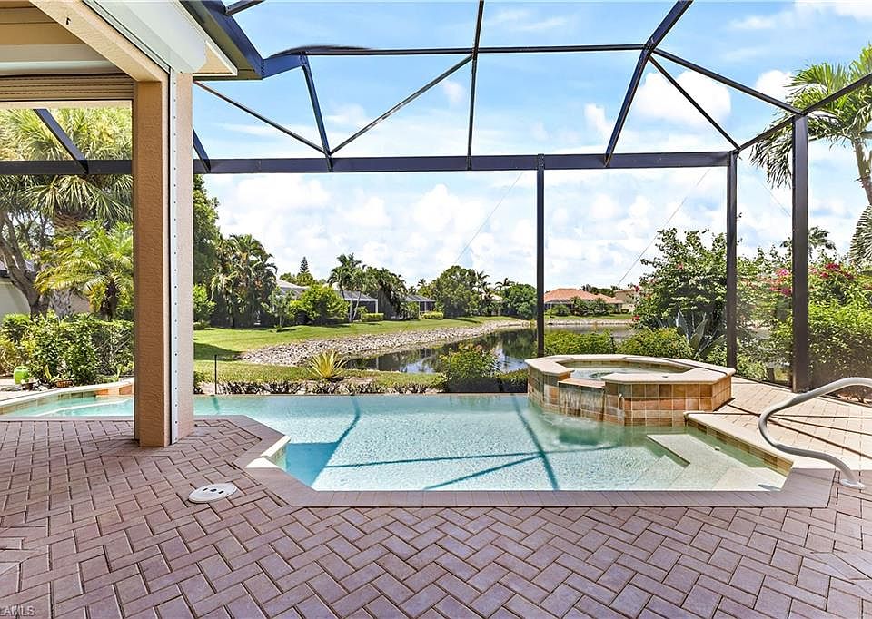 SIMPLY ELEGANT! This beautiful, highly desirable Martinique style home with nearly 2700 sq ft under air sits on a lush and spacious treed lot with a gorgeous pool and waterfall spa heated by solar panels on a nearly new roof. From the paved driveway, the paved deck, an outdoor kitchen, high dark color pool cage with panoramic screen and electric hurricane protection and a recently replaced air conditioner this home leaves nothing to desire. Oh yes, it is also on a lake/pond with a water feature. The chef's kitchen has stainless steel and is spacious with lots of cupboards. The counter space is granite and includes a large bar area. The master suite is a dream, spacious with 2 walk- in closets with built in wood shelving and drawers, 2 separate vanities areas, a jetted roman tub and a walk-through shower. Sterling Oaks offers many amenities like a heated Jr Olympic sized pool and spa, bocce, pickleball, a fitness center and a renowned optional tennis program, facility and tennis pro. Sterling Oaks is a gated community ideally located near world class beaches, shopping and easy access to RSW airport. Great opportunity.