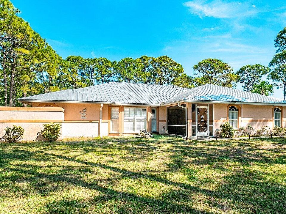 Palm Beach Country Estates on paved Rd. near Donald Ross! 4bd 2ba 2 car garage w/detached 25x34 work shop boasts split floor plan with over 2300sqft under air w/spacious kitchen over looking breakfast nook & large family room w/fireplace plus formal Living & dining areas perfect for entertaining. Step outside to enjoy 1 1/4 acres from oversized covered screen patio w/cathedral screen cage. Home also features, 2 additional storage sheds, brand new a/c and 2019 metal roof! experience living in the country with a location close to Alton, award winning golf courses and beaches!