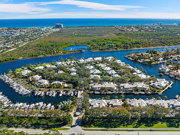 Be captivated by this beautiful, waterfront Townhome in the private guard-gated Intracoastal community of Cypress Island. Complete with 60 ft dock and 17,000 lb. lift (2021), dock can accommodate a boat from 20 - 50 foot in this 120ft canal. Recently renovated, this end-unit townhome is light and bright with impact windows and doors on all 3 sides. New expansive gourmet custom kitchen with Bosch appliances, volume ceilings, new flooring, spacious custom closets, new laundry area, master suite on main level with 2 additional guest suites on 2nd level each with en-suite baths. Office area is overlooking marina. Covered large, lower level patio with a fenced yard for Fido and an upper covered patio that overlooks marina and canal. Enjoy the large community pool just steps away. Live close to shopping, dining, beaches and only 20 minutes to PBI. Move-In ready for you and your family to begin enjoying the tranquil sanctuary that is Cypress Island this season.