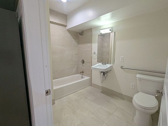 *Stylish bathroom with tiled shower/tub combo, floating vanity, and chrome fixtures