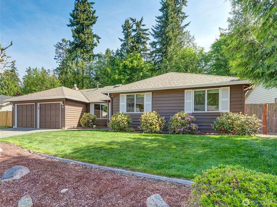 Rambler in excellent community of Silver Firs. Nice floor plan with 3 bedrooms, 2 full bathrooms, living & dining room with vaulted ceiling & new lighting. Kitchen with granite counters & room for a breakfast nook. Family room with gas fireplace. Large private fully fence yard with a deck & patio. Primary bedroom w/full bathroom with a walk-in jacuzzi tub. Guest bath is also a full bathroom. 2 car garage & room for driveway parking. Brand new carpet in all 3 bedrooms & easy-care laminate floors in main living areas. New exterior & interior paint. New roof in 2021. Community parks & play fields. Easy Hwy access, close to shopping, restaurants, county park & YMCA. Great schools.
