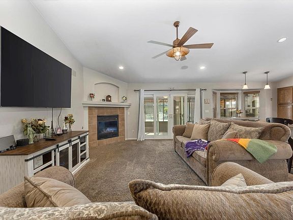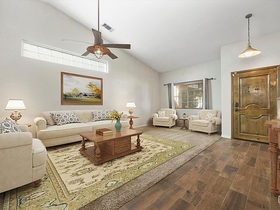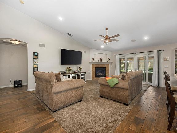 This NW 4bdr/2ba home offers a perfect blend of comfort and functionality. The family room and formal living room feature soaring vaulted ceilings and a cozy fireplace, seamlessly connecting to the kitchen. The kitchen boasts ample cabinetry, neutral tiles, a built-in beverage cooler, an island with bar-top seating, and a bright breakfast area. An enclosed sunroom, complete with dual ceiling fans, provides a versatile space for relaxation or entertaining. The primary bedroom serves as a relaxing sanctuary, featuring dual closets, a luxurious jetted tub, and dual sinks. The spacious backyard offers a great opportunity for a relaxing retreat, with a sparkling pool with a rock waterfall and spa, a fully equipped outdoor BBQ kitchen area with bar-top seating and a log cabin style pool house/storage shed with electrical. Multiple covered patio areas provide ample space for outdoor gatherings, while additional storage sheds and block wall fencing add practicality and privacy.