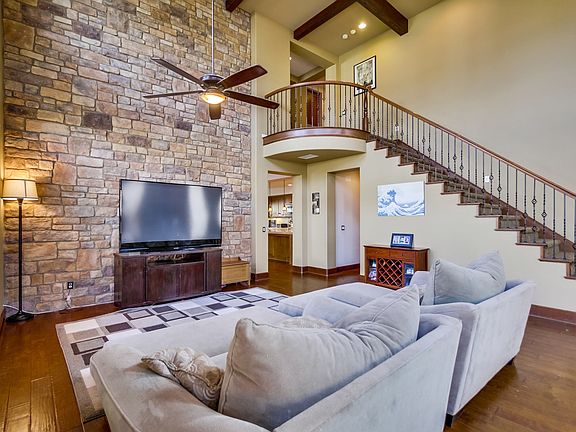 Gorgeous home with grand entrance, high ceiling, exposed beams and beautiful hardwood floors throughout main living area. There's 5 bedrooms /4.5 baths with 1 bed & 1 bath down. Living/dining area has custom stone feature wall. Spacious open floor plan with clear sight lines between kitchen, breakfast nook and family room. Oversized island has dine in bar. The master suite is a must see complete with fireplace, his and hers sinks, separate shower and tub and walk in closets. Home has huge yard!