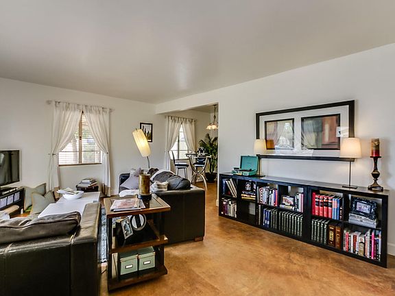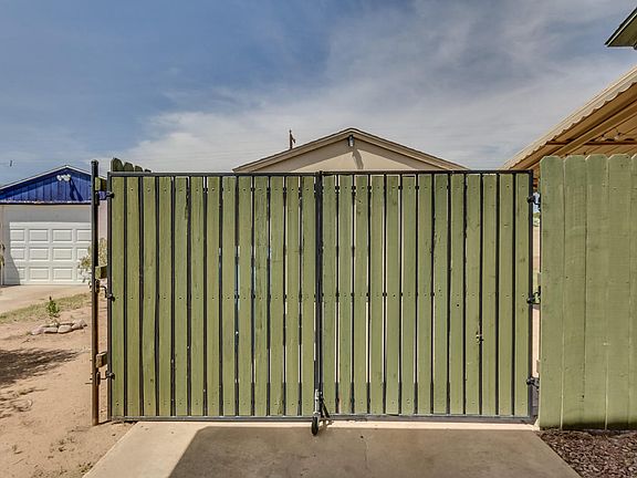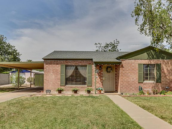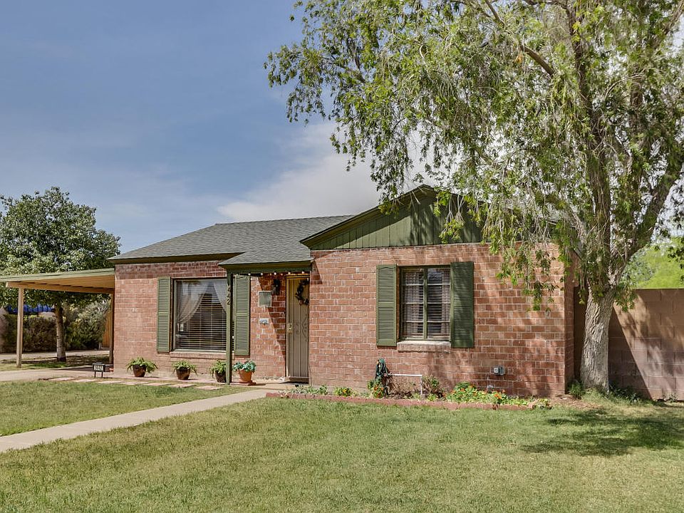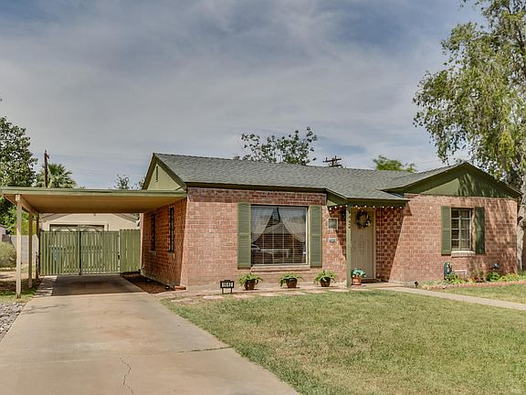 Gorgeous brick bungalow with fresh paint, block-walled grassy yard with sprinklers front and back, front sidewalk, attached carport + detached garage with lots of storage. Double gates lead from carport to garage for drive-thru, but secured yard for pets or children. Cozy kitchen with window over sink and antique oven leads to inside laundry room with back door. Fancy security doors on both front and back. Covered patio off kitchen. Colored concrete floors and pottery barn drapes complete this retro picture. Ideal for access to all medical facilities, walk to school, & downtown entertainment. Must see!